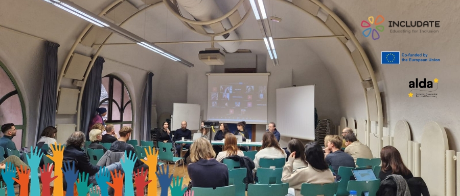 Diving into the content, the focus of the morning’s session was the INCLUDATE project (Educating for Inclusion). The project, with a focus on marginalized groups, particularly migrants, seeks to build capacity within migrant associations and dismantle participation barriers at the local level.