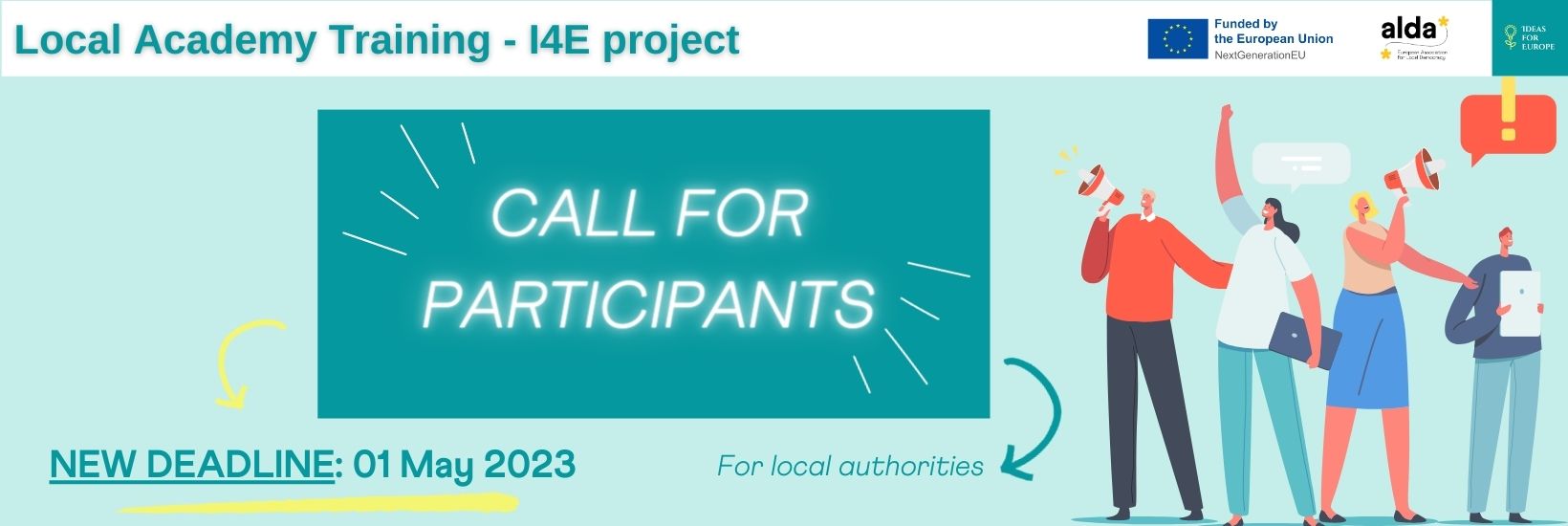 ALDA – European Association for Local Democracy, in the framework of the Ideas 4 Europe project, would like to invite you to participate in the Local Academy Training organised in the framework of the I4E project, co-funded by the EU funding programme CERV, aiming to boost political participation with a focus on citizen and young people living in peri-urban and rural areas.